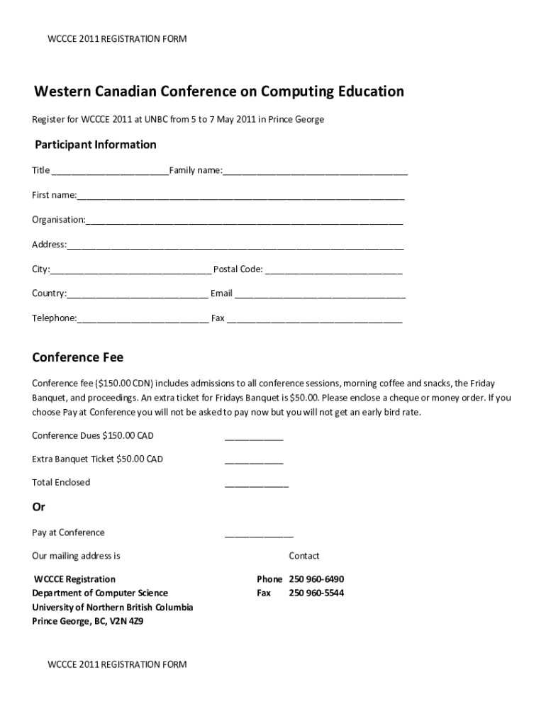 WCCC 2011 REGISTRATION FORM Western Canadian Conference on Computing Education Register for WCCC 2011 at UNC from 5 to 7 May 2011 in Prince GeorgeParticipant Information Title Family name: First name: