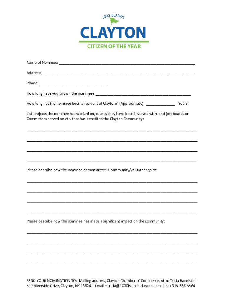 Name of Nominee: Address: Phone: How long have you known the nominee? How long has the nominee been a resident of Clayton? (Approximate) Years List projects the nominee has worked on, causes they
