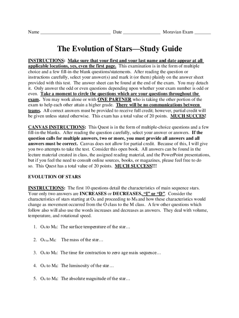 Name Date Moravian Exam The Evolution of StarsStudy Guide INSTRUCTIONS: Make sure that your first and your last name and date appear at all applicable locations, yes, even the first page. This examination