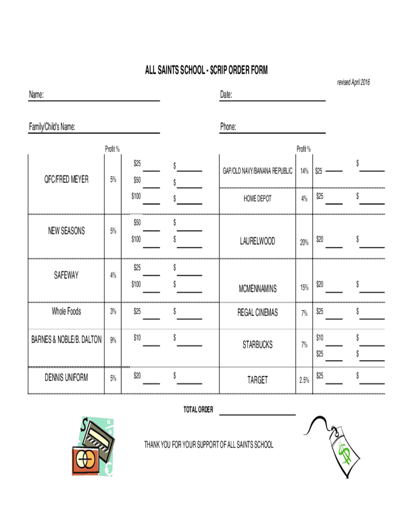 ALL SAINTS SCHOOL $CRIP ORDER FORM revised April 2016Name:Date:Family/Child's Name:Phone: Profit QFC/FRED MEYER SEASONSSAFEWAY5%5%4%Profit % $$$$$$$25$$50$$100$$501002510014%$25HOME DEPOT4%$$25LAURELWOOD20%$$$20MCMENNAMINS15%$$20REGAL