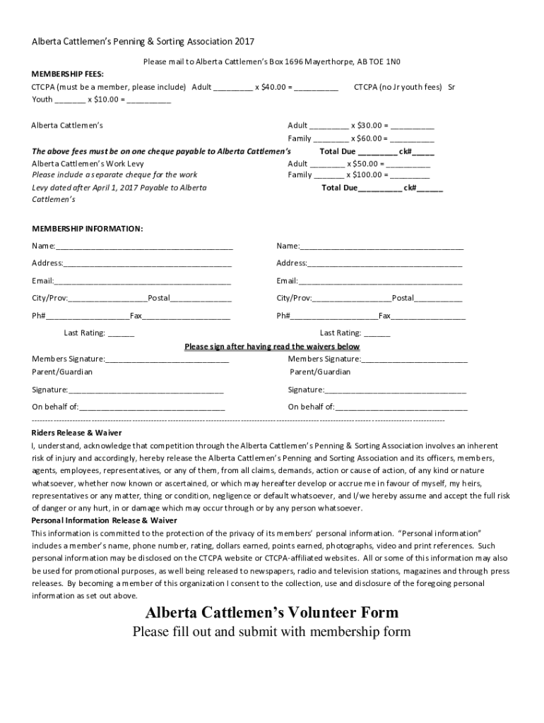 Alberta Cattlemen Penning & Sorting Association 2017 Please mail to Alberta Cattlemen Box 1696 Mayerthorpe, AB TOE 1N0 MEMBERSHIP FEES: CT CPA (must be a member, please include) Adult x $40.00 Youth