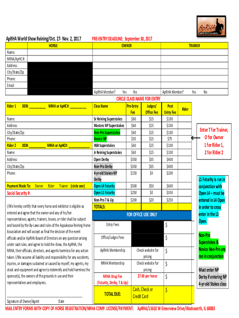 Participants must report horse registration details, rider's information, class entries, and payment details on the APHA World Show ReiningOct form.