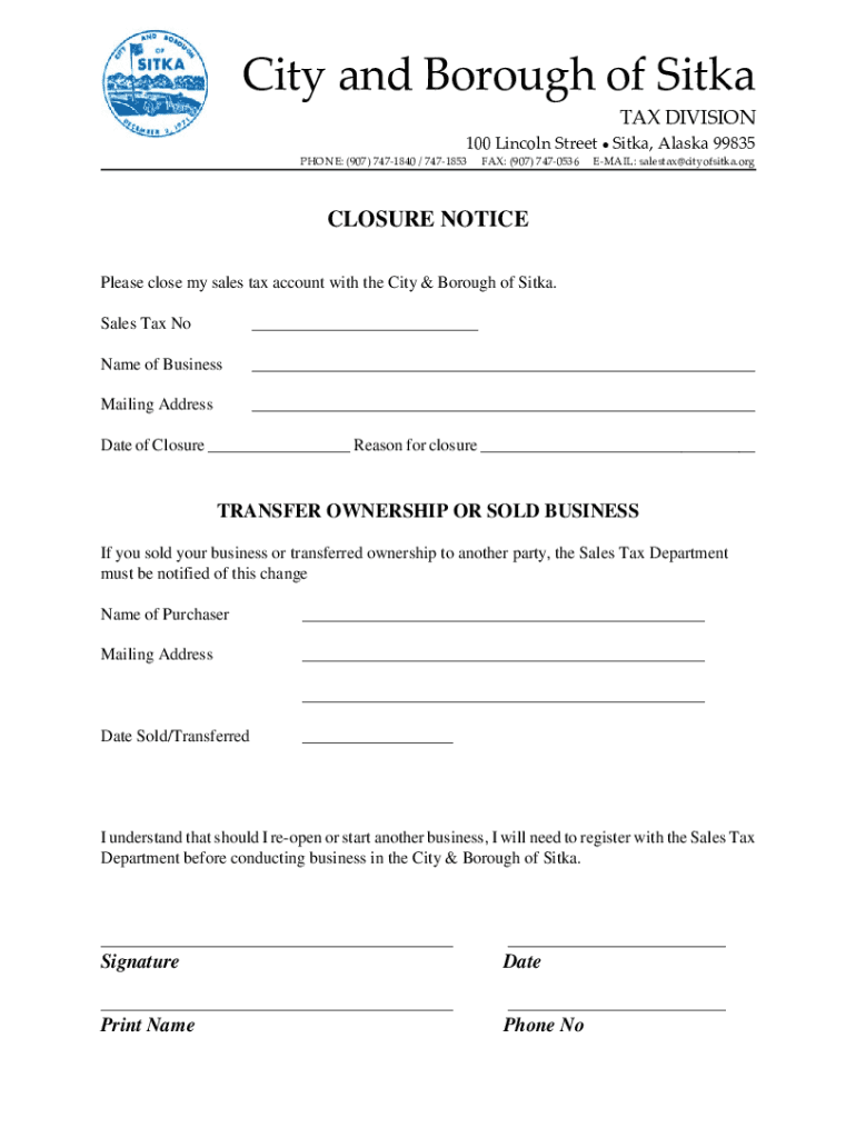 City and Borough of Site TAX DIVISION 100 Lincoln Street Site, Alaska 99835PHONE: (907) 7471840 / 7471853FAX: (907) 7470536EMAIL: sales tax cityofsitka. Foreclosure NOTICE Please close my sales tax