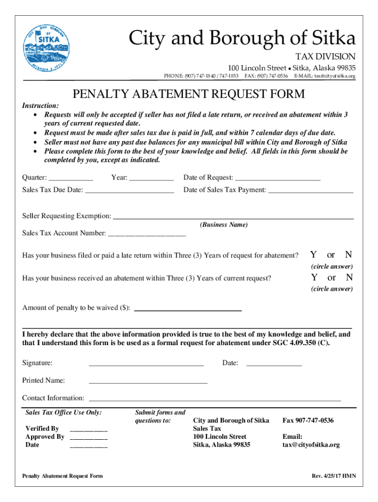 City and Borough of Site TAX DIVISION100 Lincoln Street Site, Alaska 99835PHONE: (907) 7471840 / 7471853FAX: (907) 7470536EMAIL: tax cityofsitka. Penalty ABATEMENT REQUEST FORM Instruction: Requests