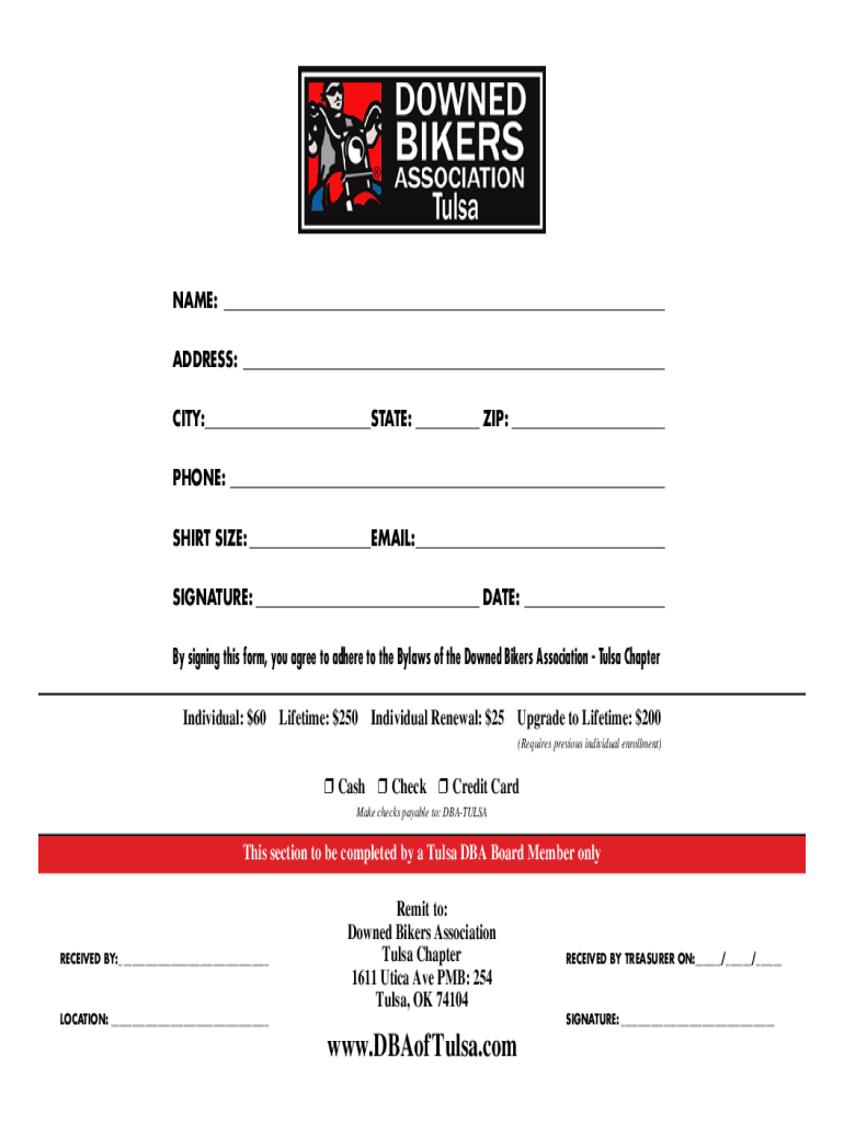 NAME: ADDRESS: CITY: STATE: ZIP: PHONE: SHIRT SIZE: EMAIL: SIGNATURE: DATE: By signing this form, you agree to adhere to the Bylaws of the Downed Bikers Association Tulsa Chapter Individual: $60 Lifetime: