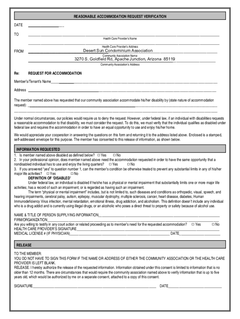 REASONABLE ACCOMMODATION REQUEST VERIFICATION DATE TO Health Care Providers Name Health Care Providers AddressFROMDesert Sun Condominium Association Community Association Name3270 S. Goldfield Rd,