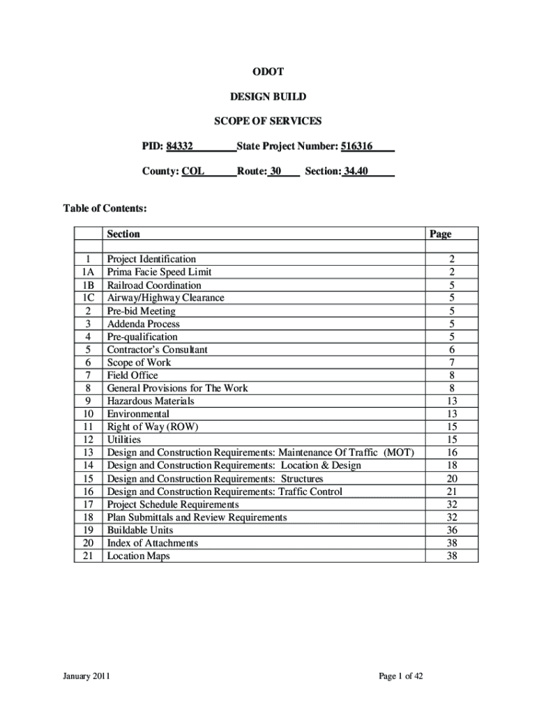 Get the free ODOT DESIGN BUILD SCOPE OF SERVICES PID: 84332 State Project Number: 516316 County: ...
