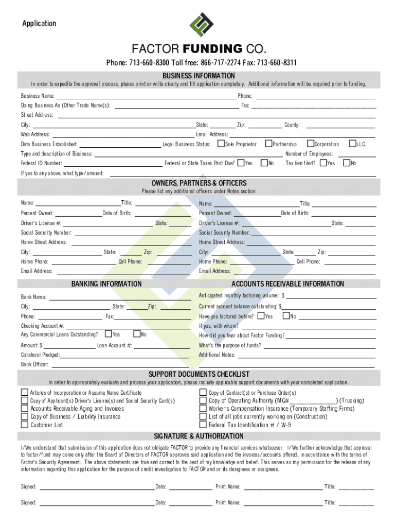 ApplicationFACTOR FUNDING CO. Phone: 7136608300 Toll free: 8667172274 Fax: 7136608311 BUSINESS INFORMATION In order to expedite the approval process, please print or write clearly and fill application