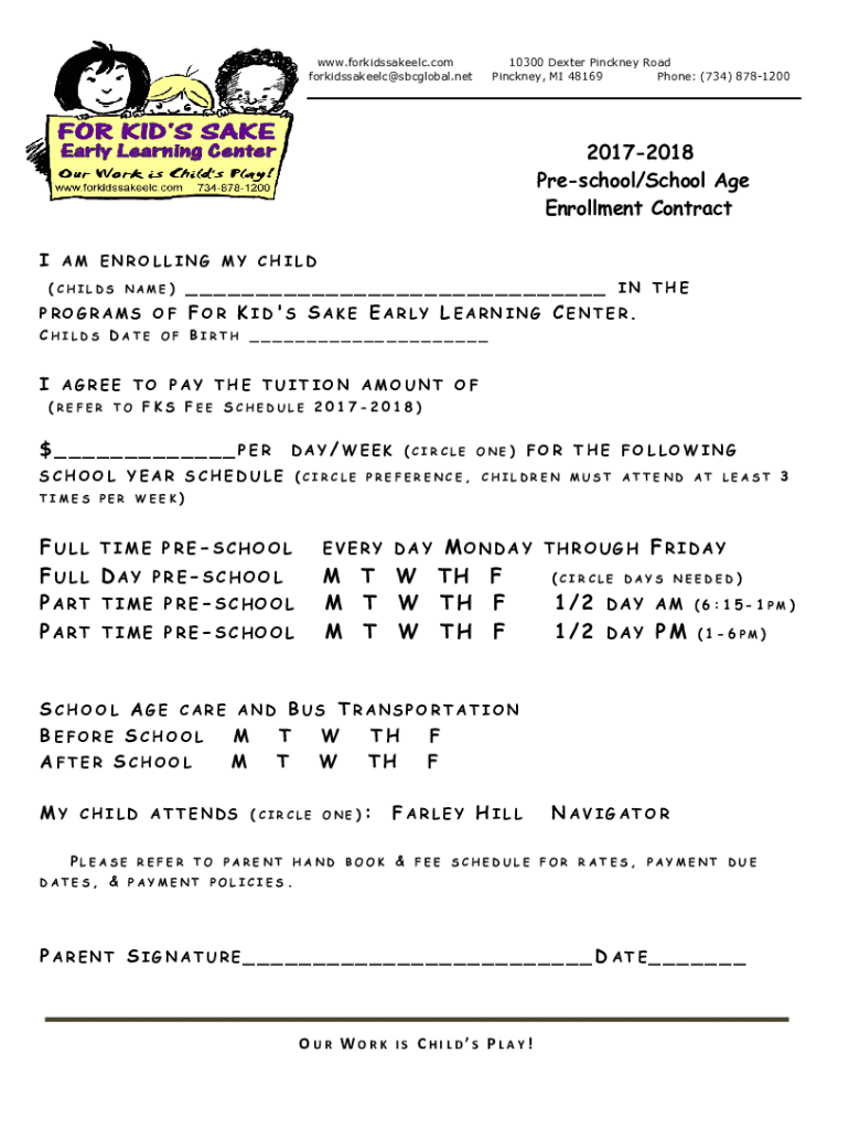 WWW.forkidssakeelc.com forkidssakeelc global.net10300 Dexter Pinckney Road Pinckney, MI 48169 Phone: (734) 878120020172018 Preschool/School Age Enrollment Contract I AM ENROLLING MY CHILD (CHILD NAME)