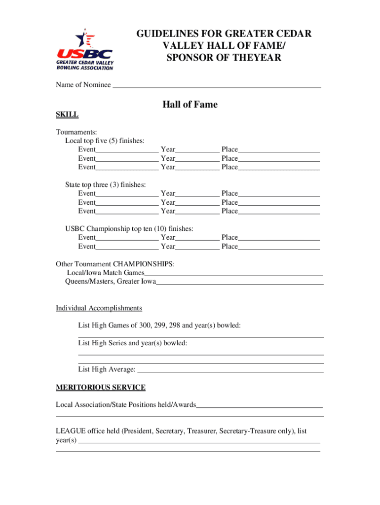 GUIDELINES FOR GREATER CEDAR VALLEY HALL OF FAME/ SPONSOR OF THEREAT Name of Nominee Hall of Fame SKILL Tournaments: Local top five (5) finishes: Event Year Place Event Year Place Event Year Place