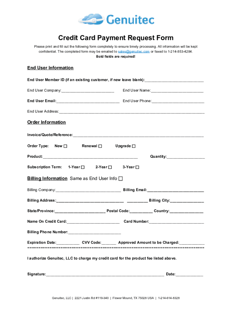 Credit Card Payment Request Form Please print and fill out the following form completely to ensure timely processing. All information will be kept confidential. The completed form may be emailed to