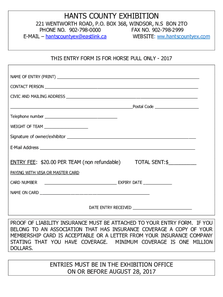 HANDS COUNTY EXHIBITION221 WENTWORTH ROAD, P.O. BOX 368, WINDSOR, N. S ON 2TO PHONE NO. 9027980000 FAX NO. 9027982999 EMAIL hantscountyex east link.ca WEBSITE: WW.hantscountyex.this ENTRY FORM IS