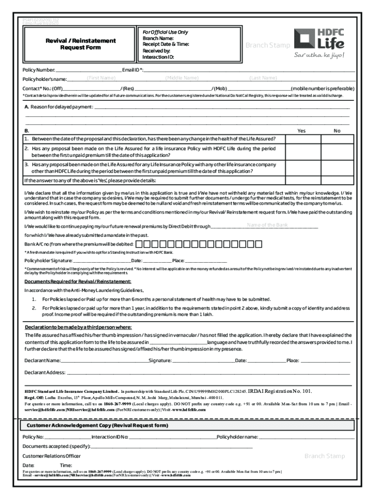 PSRF102202091312 Comp/Aug/Int/2620Revival / Reinstatement Request Former Official Use Only Branch Name: Receipt Date & Time: Received by: Interaction ID:Branch StampPolicy Number: Email ID *: (First