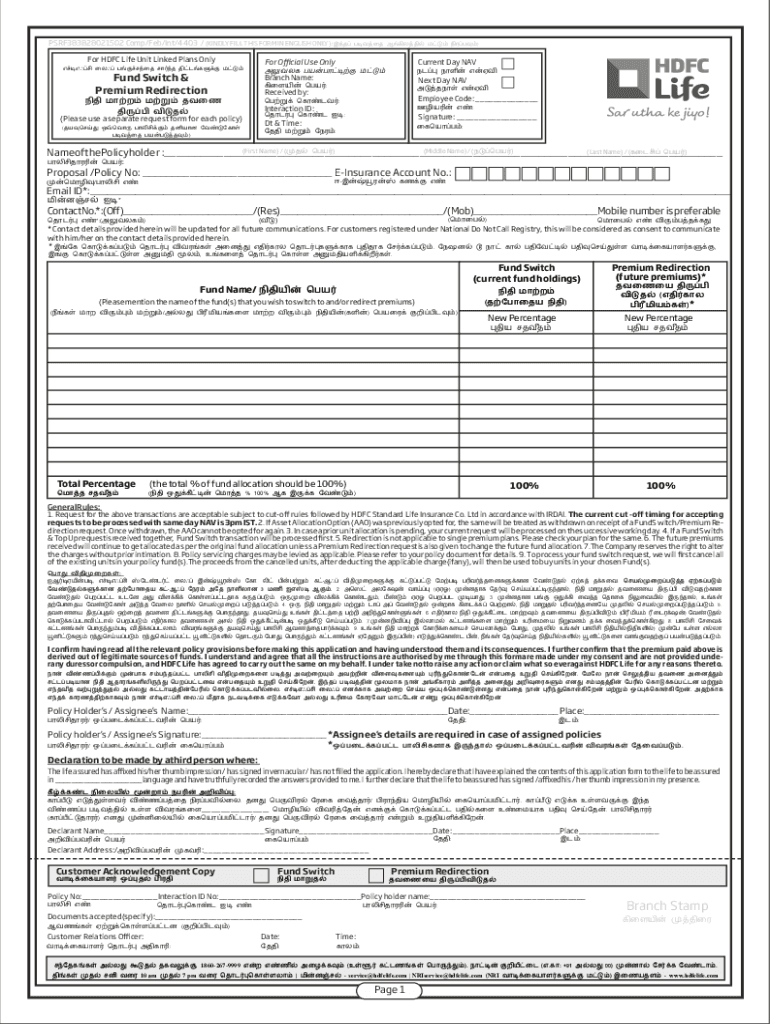PSRF383828021502 Comp/Feb/Int/4403 / (KINDLY FILL THIS FORM IN ENGLISH ONLY) (For HDFC Life Unit Linked Plans Only Fund Switch & Premium Redirection (Please use a separate request form for