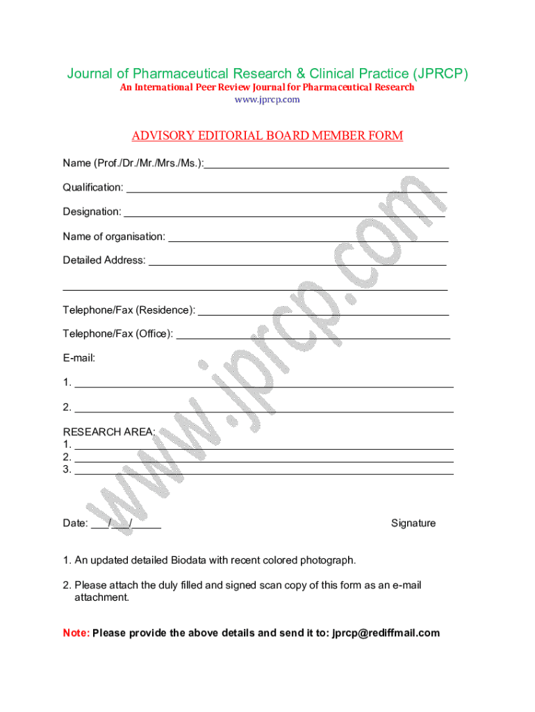 Journal of Pharmaceutical Research & Clinical Practice (JP RCP) An International Peer Review Journal for Pharmaceutical Research www.jprcp.comADVISORY EDITORIAL BOARD MEMBER FORM Name (Prof./Dr./Mr./Mrs./Ms.):