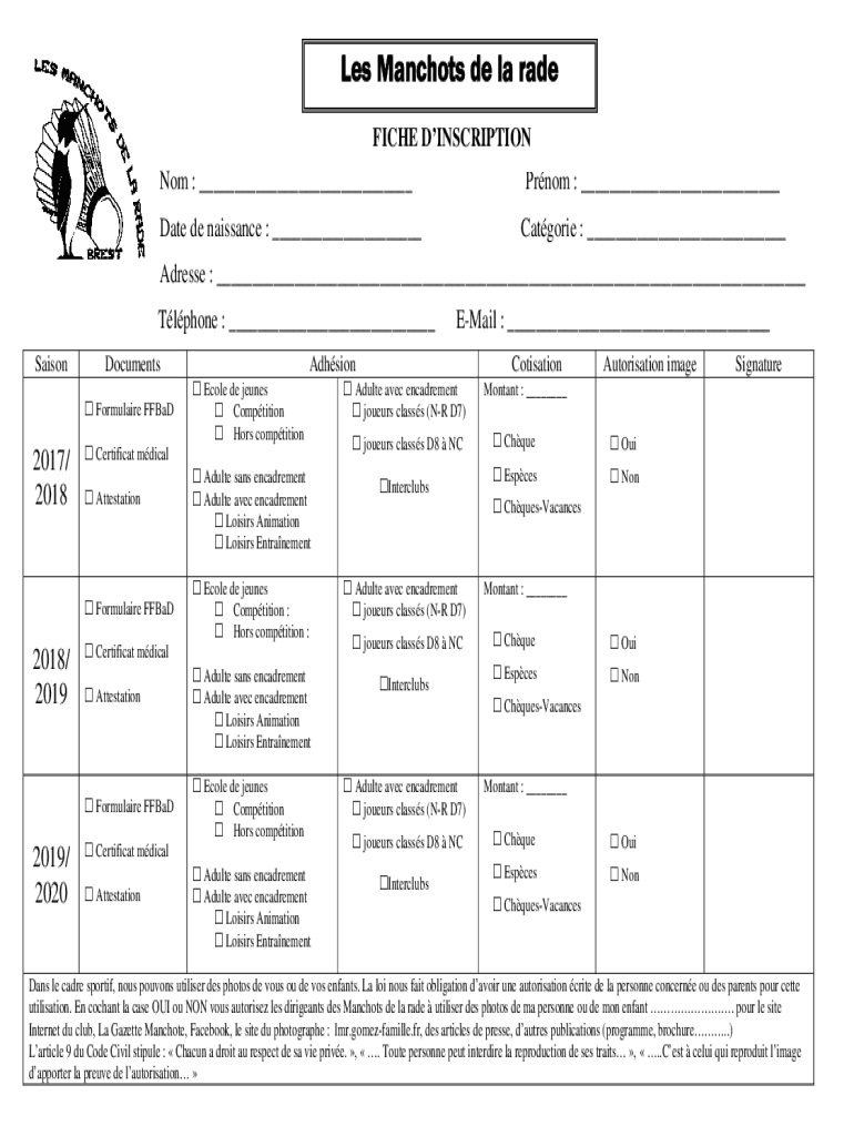 Les Anchors DE la made FICHE INSCRIPTION Not : Prom : Date de Renaissance : Categories : Address : Tl phone : SaisonDocuments Formula ire FFBaD2017/ 2018Formulaire FFBaD2018/ 2019Attestationjoueurs