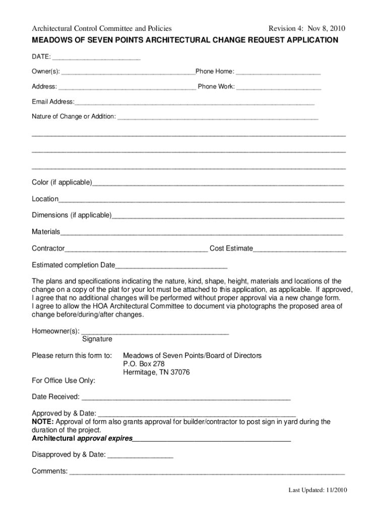 Architectural Control Committee and PoliciesRevision 4: Nov 8, 2010MEADOWS OF SEVEN POINTS ARCHITECTURAL CHANGE REQUEST APPLICATION DATE: Owner(s): Phone Home: Address: Phone Work: Email Address: