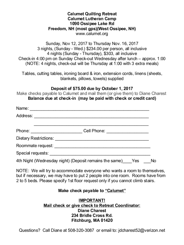 Calumet Quilting Retreat Calumet Lutheran Camp 1090 Gossiped Lake Rd Freedom, NH (most GPS)(West Gossiped, NH) www.calumet.org Sunday, Nov 12, 2017 to Thursday Nov. 16, 2017 3 nights, (Sunday Wed.)