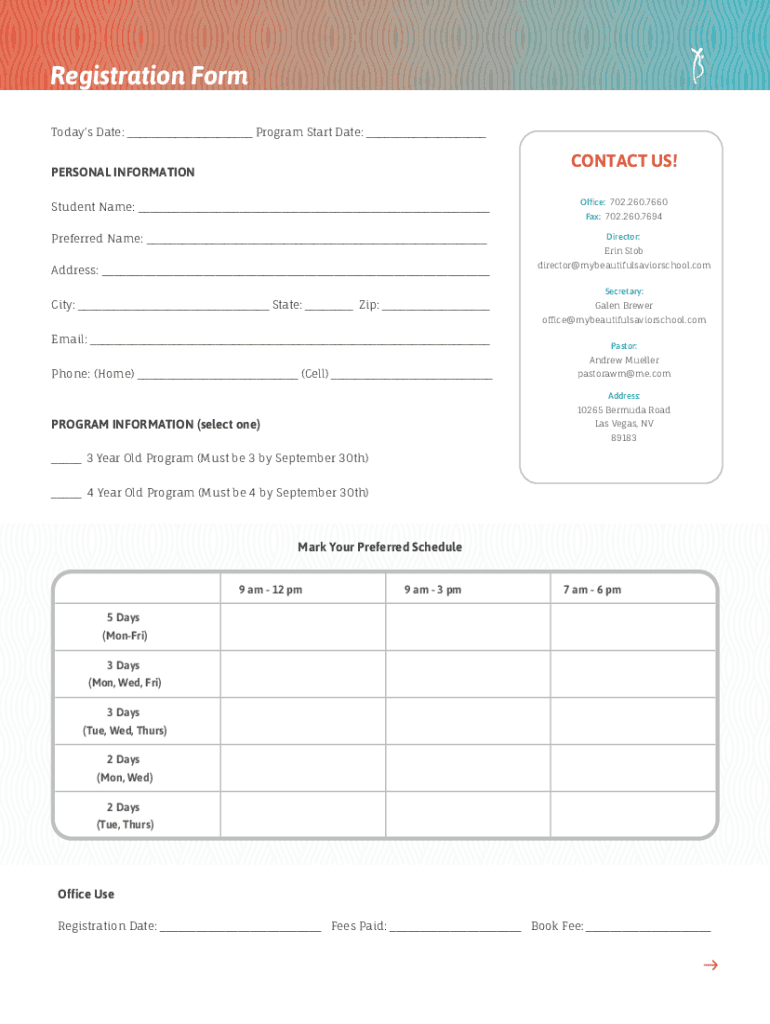 Registration Form Today's Date: Program Start Date: CONTACT US!PERSONAL INFORMATION Student Name: Preferred Name: Office: 702.260.7660 Fax: 702.260.7694 Director: Erin StobAddress: director mybeautifulsaviorschool.comity: