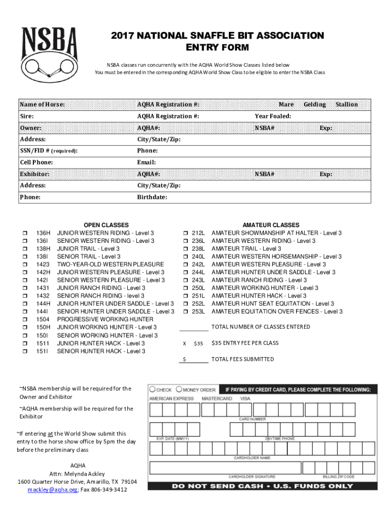 Get the free 2017 NATIONAL SNAFFLE BIT ASSOCIATION ENTRY FORM