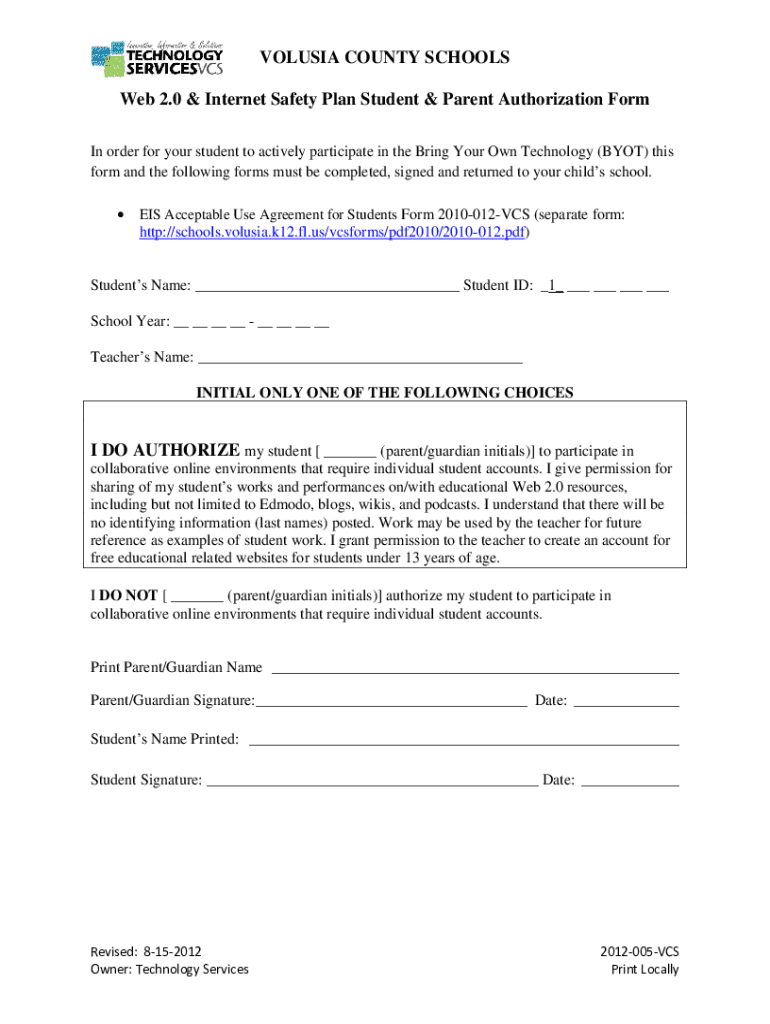 VOLUSIA COUNTY SCHOOLS Web 2.0 & Internet Safety Plan Student & Parent Authorization Form In order for your student to actively participate in the Bring Your Own Technology (BOOT) this form and the