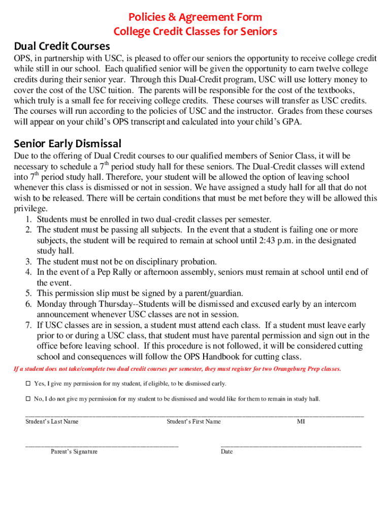 Policies & Agreement Form College Credit Classes for Seniors Dual Credit Courses OPS, in partnership with USC, is pleased to offer our seniors the opportunity to receive college credit while still