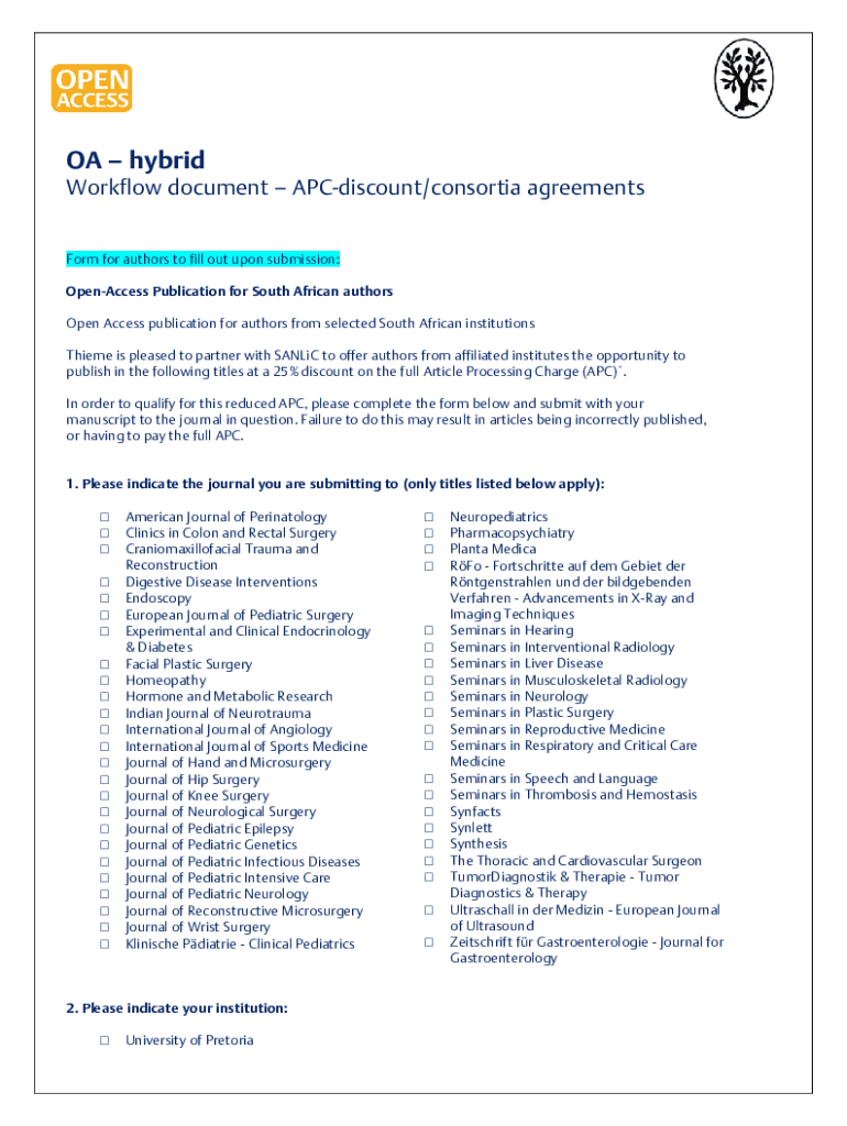 OA hybridWorkflow document APC discount/consortia agreements Form for authors to fill out upon submission: Openness Publication for South African authors Open Access publication for authors from selected
