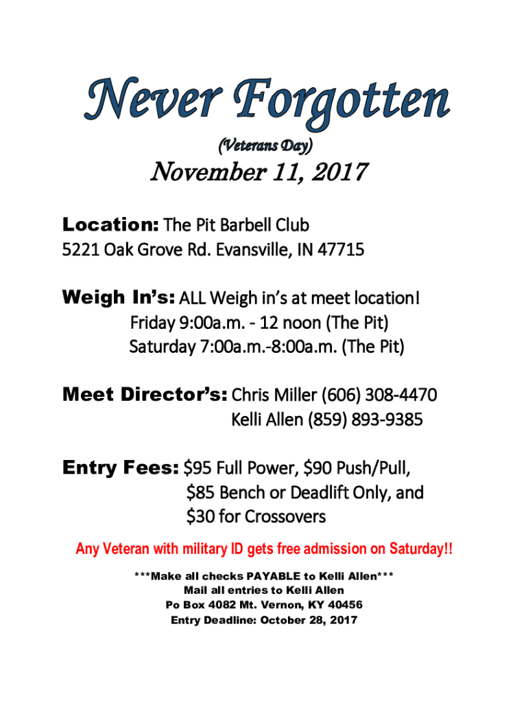 Location: The Pit Barbell Club 5221 Oak Grove Rd. Evansville, IN 47715 Weigh Ins: ALL Weigh ins at meet location! Friday 9:00a.m. 12 noon (The Pit) Saturday 7:00a.m.8:00a.m. (The Pit) Meet Directors: