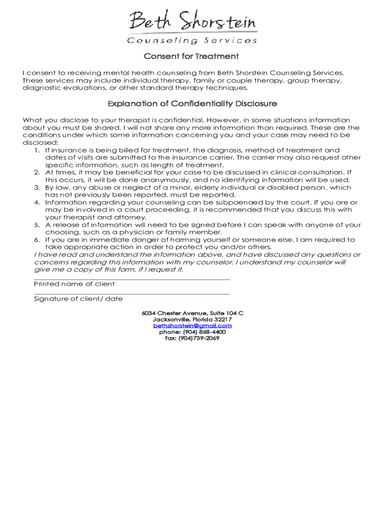 I consent to receiving mental health counseling from Beth Holstein Counseling Services.