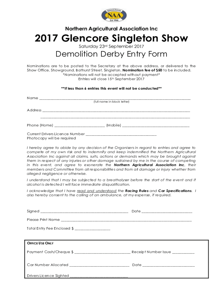 Northern Agricultural Association Inc2017 Glen core Singleton Show Saturday 23rd September 2017Demolition Derby Entry Form Nominations are to be posted to the Secretary at the above address, or delivered
