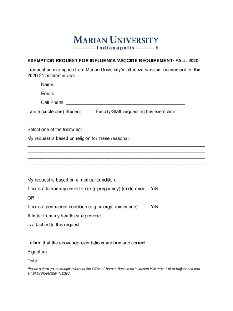 EXEMPTION REQUEST FOR INFLUENZA VACCINE REQUIREMENT FALL 2020 I request an exemption from Marian Universities' influenza vaccine requirement for the 202021 academic year. Name: Email: Cell Phone: