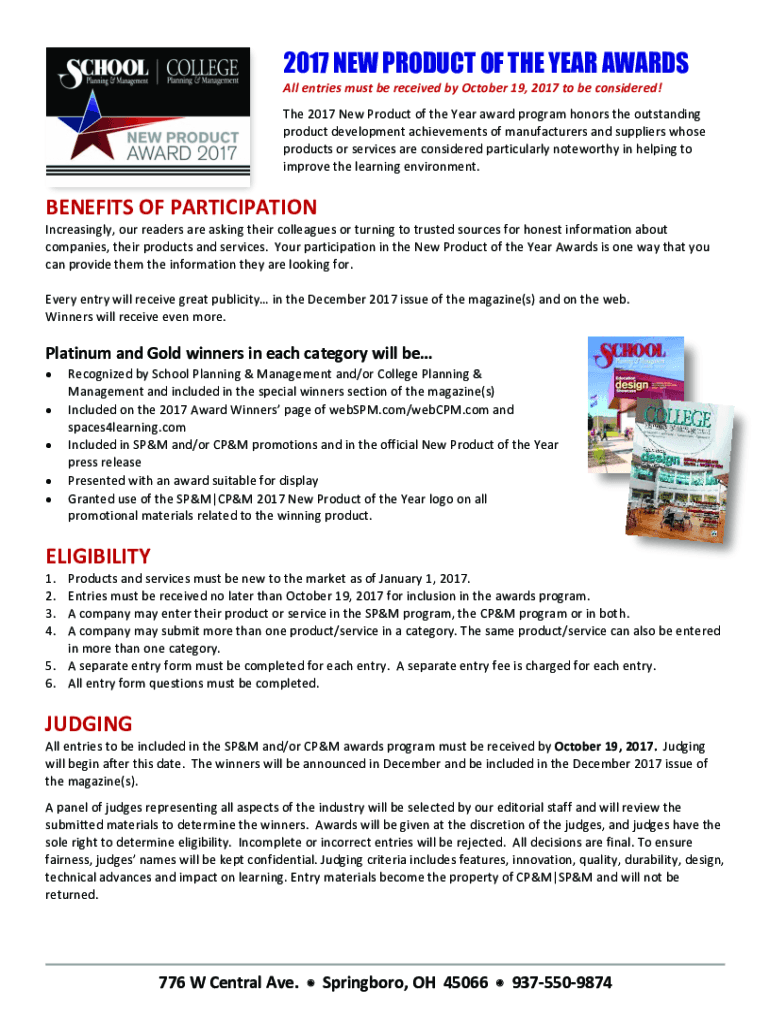 AllentriesmustbereceivedbyOctober19,2017tobeconsidered! The2017NewProductoftheYearawardprogramhonorstheoutstanding