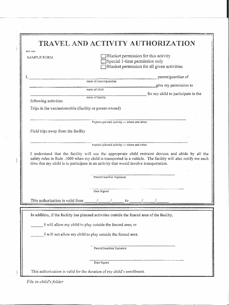 TRAVEL AND ACTIVITY AUTHORIZATION REV 3/00o Blanket permission for this activity o Special time permission only o Blanket permission for all given activitiesSAMPLE FORM, parent/guardian of name of