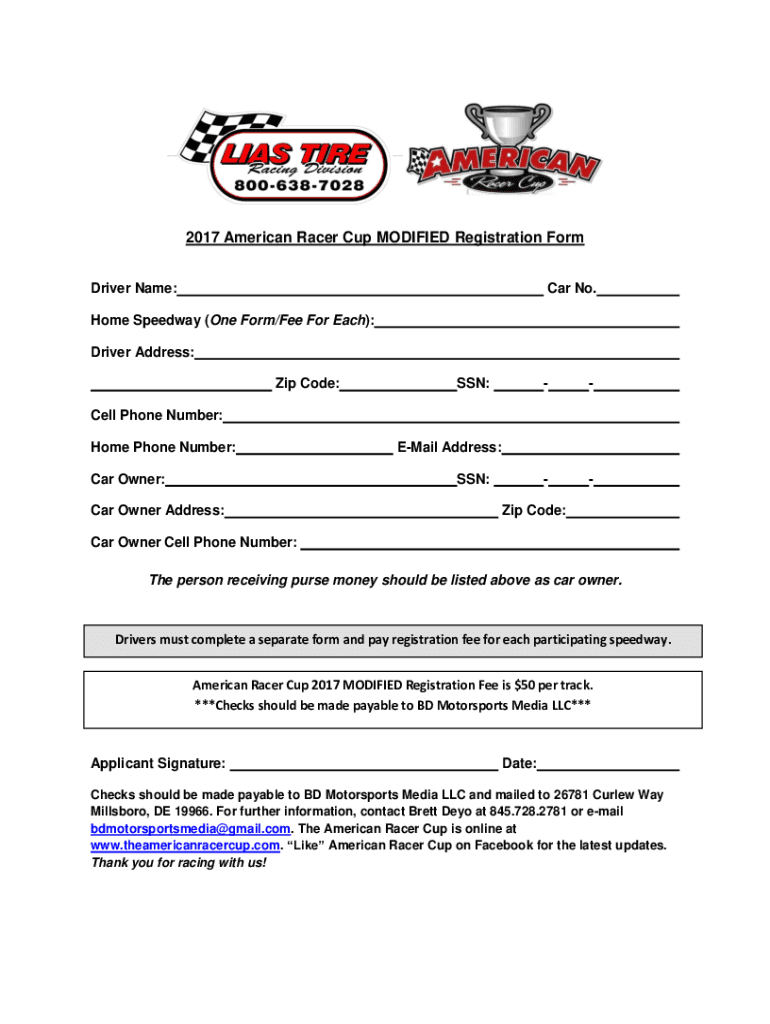 2017 American Racer Cup MODIFIED Registration Form