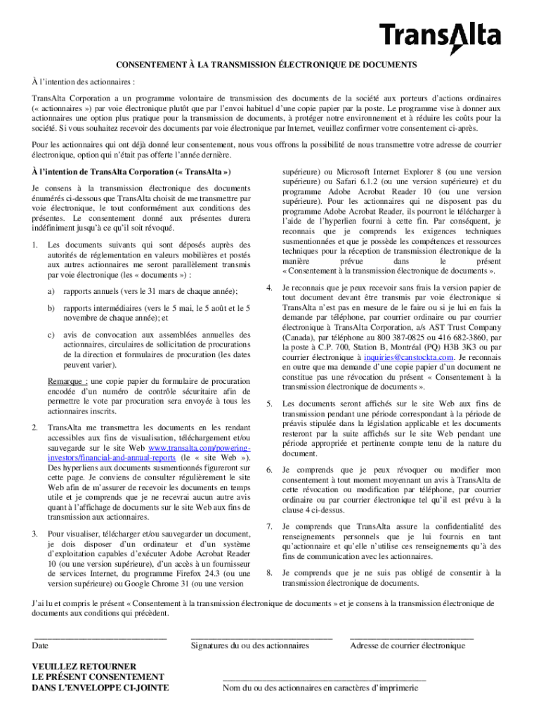 CONTENTMENT LA TRANSMISSION VERONIQUE DE DOCUMENTS intention DES legionnaires : TransAlta Corporation a UN program Voltaire de transmission DES documents DE la so cit aux porters actions ordinaries
