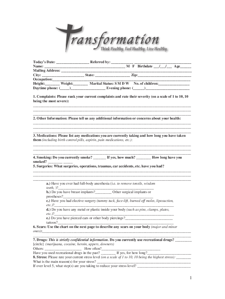 Today's Date: Referred by: Name: M F Birthdate / / Age Mailing Address: City: State: Zip: Occupation: Height: Weight: Marital Status: S M D W No. of children: Daytime phone: () Evening phone: () 1.