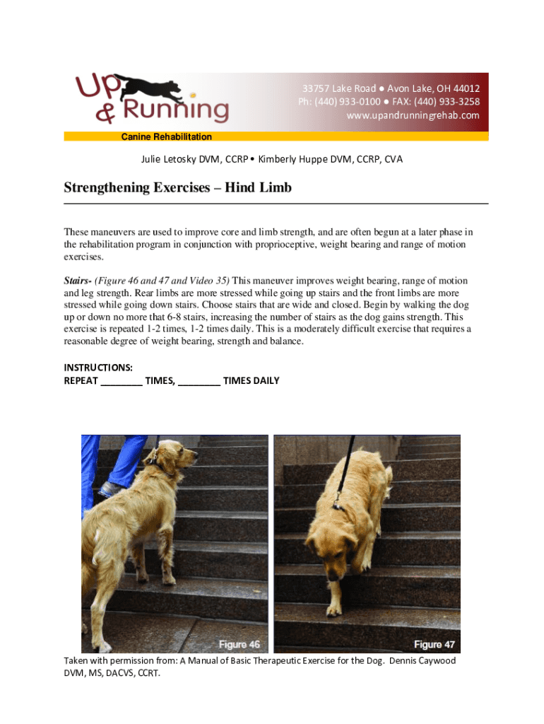 33757 Lake Road Avon Lake, OH 44012 pH: (440) 9330100 FAX: (440) 9333258 www.upandrunningrehab.com Canine Rehabilitation Julie Lets DVM, CORP Kimberly Upper DVM, CORP, Strengthening Exercises Hind