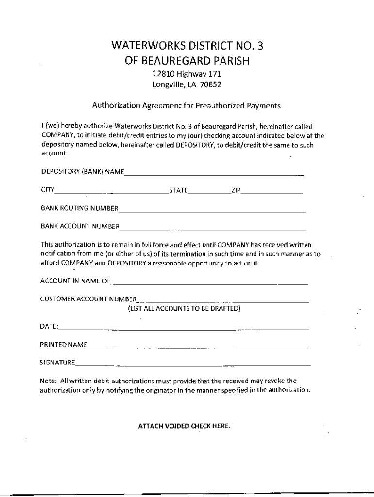 WATERWORKS DISTRICT NO. 3 OF BEAUREGARD PARISH 12810 Highway 171 Linville, LA 70652 Authorization Agreement for Preauthorized Payments I (we) hereby authorize Waterworks District No. 3 of Beauregard