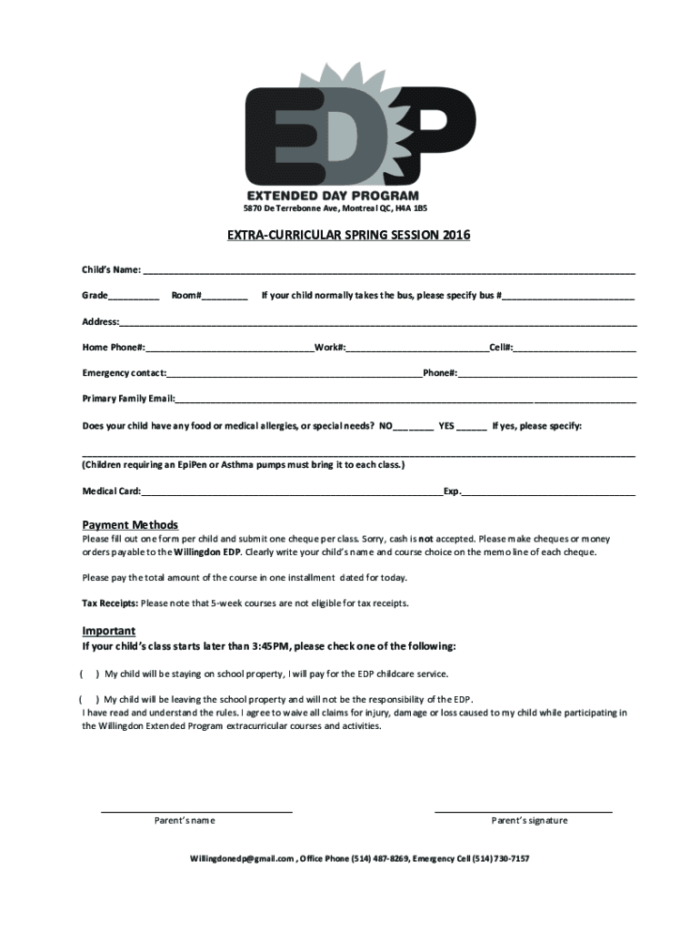 5870 De Terrebonne Ave, Montreal QC, H4A 1B5EXTRACURRICULAR SPRING SESSION 2016Childs Name: Grade Room# If your child normally takes the bus, please specify bus # Address: Home Phone#: Work#: Cell#: