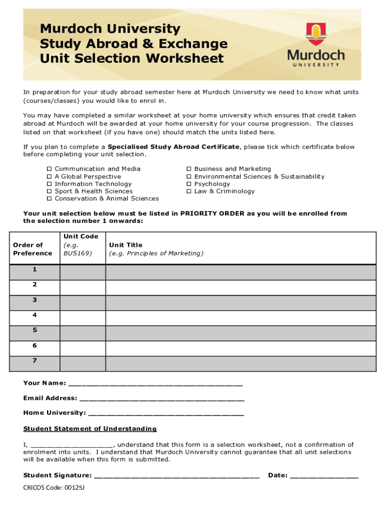 Murdoch University Study Abroad & Exchange Unit Selection Worksheet In preparation for your study abroad semester here at Murdoch University we need to know what units (courses/classes) you would