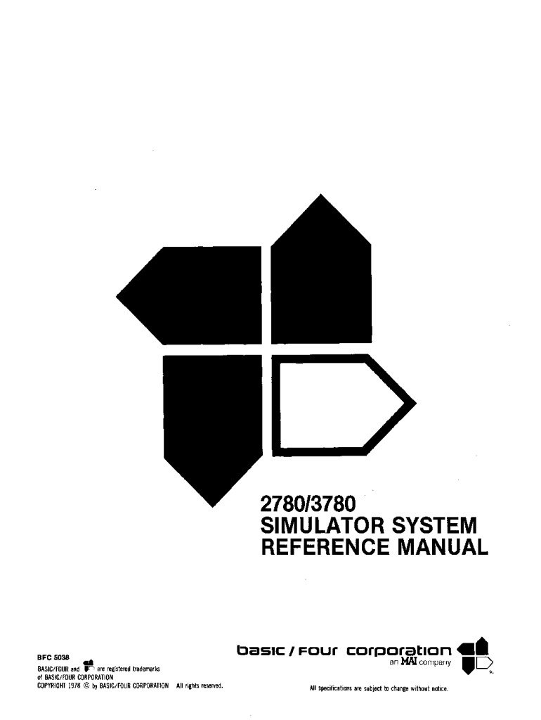 2780/3780 SIMULATOR SYSTEM REFERENCE MANUALbasIc I Four corporation, DBC 5038 BASIC/FOUR and are registered trademarks of BASIC/FOUR CORPORATION COPYRIGHT 1978 by BASIC/FOUR CORPORATION an All rights