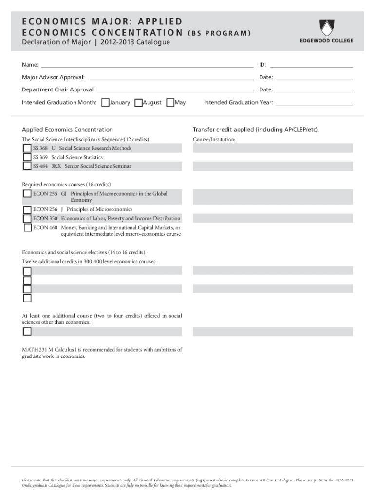 ECONOMICS MAJOR: APPLIED E C O N O M I C S C O N C E N T R AT I O N(BS PROGRAM)Declaration of Major 20122013 Catalog Name: ID: Major Advisor Approval: Date: Department Chair Approval: Date: Intended