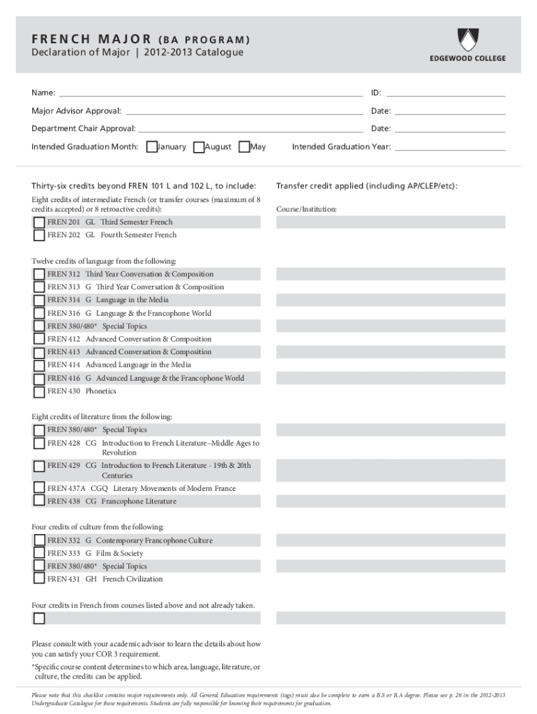 FRENCH MAJOR(BA PROGRAM) Declaration of Major 20122013 CatalogueName: ID: Major Advisor Approval: Date: Department Chair Approval: Date: Intended Graduation Month:F January August Intended Graduation