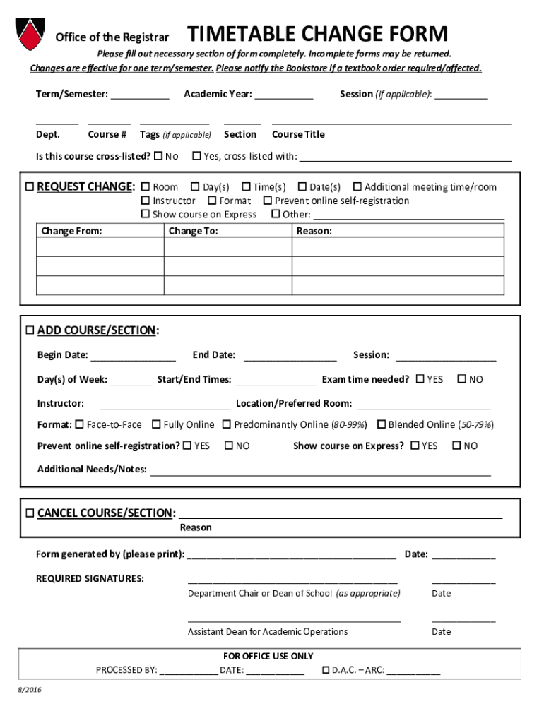 Office of the RegistrarTIMETABLE CHANGE Formulas fill out necessary section of form completely. Incomplete forms may be returned. Changes are effective for one term/semester. Please notify the Bookstore