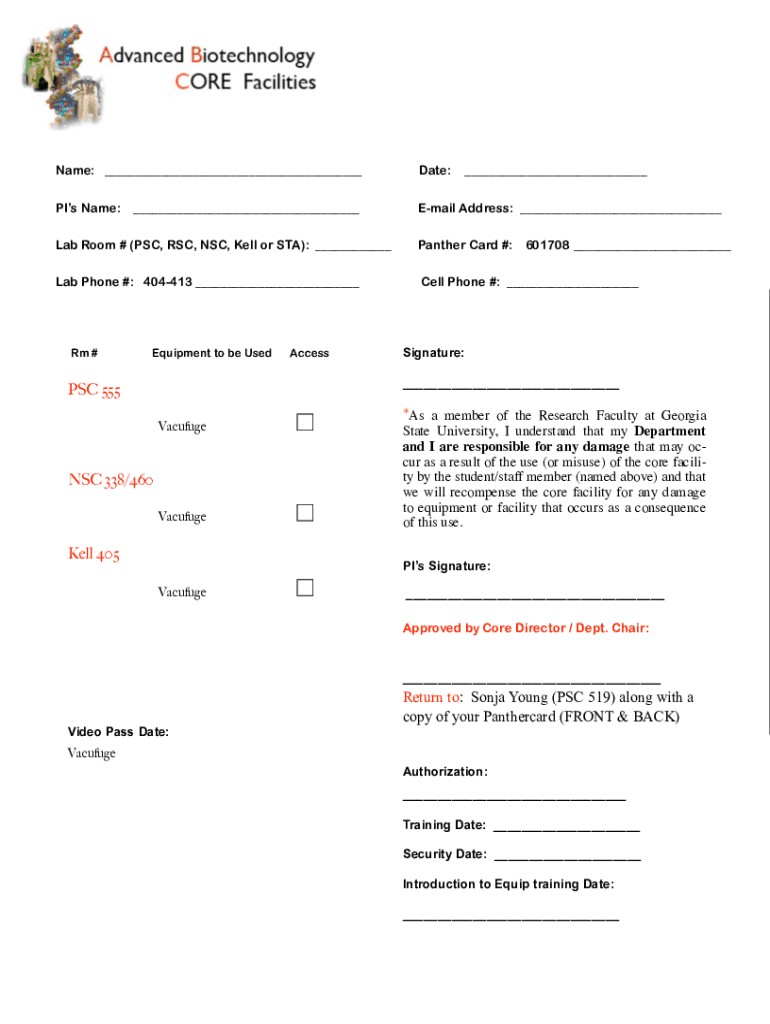 Name: Date:PI's Name:Email Address: Lab Room # (PSC, RSC, NSC, Well or STA): Panther Card #:Lab Phone #: 404413 Cell Phone #: Rm #Equipment to be UsedAccess601708 Signature: PSC 555 VacufugeNSC 338/460