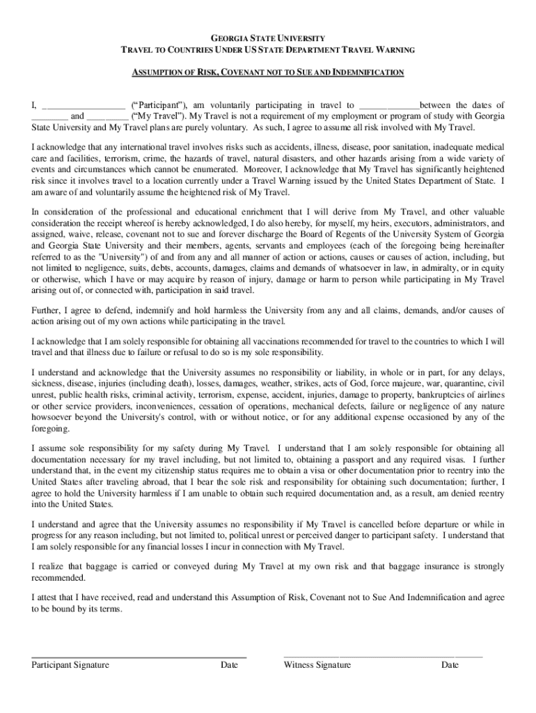 GEORGIA STATE UNIVERSITY TRAVEL TO COUNTRIES UNDER US STATE DEPARTMENT TRAVEL WARNING ASSUMPTION OF RISK, COVENANT NOT TO SUE AND INDEMNIFICATION I, (Participant), am voluntarily participating in