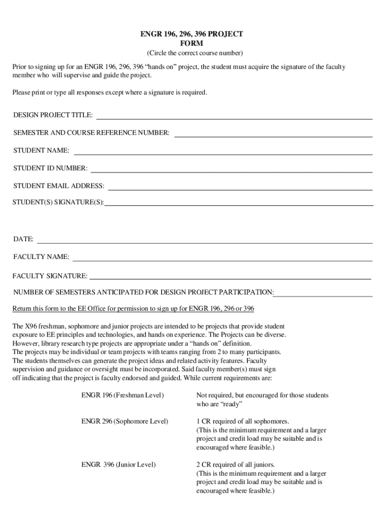Prior to signing up for an ENG 196, 296, 396 hands-on project, the student must acquire the signature of the faculty