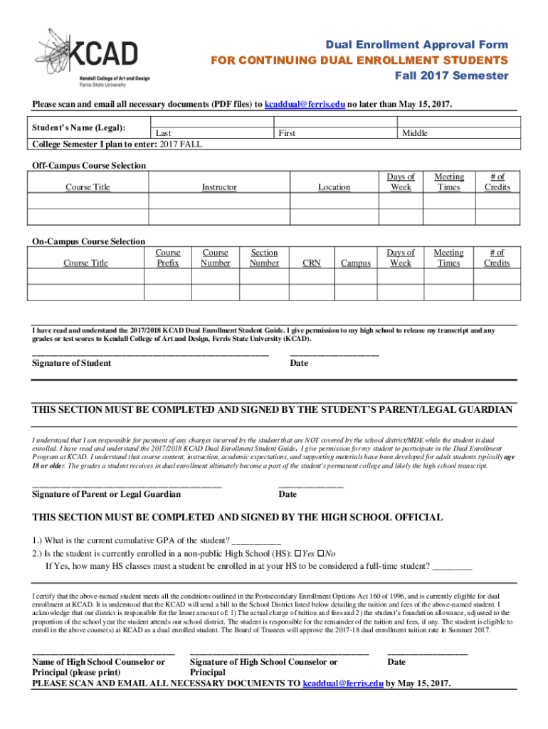 Please scan and email all necessary documents (PDF files) to kcaddual@ferris.edu no later than May 15, 2017.