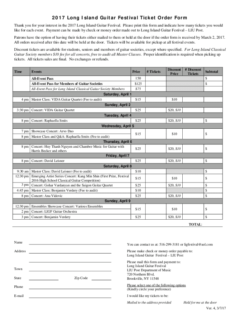 2017 Long Island Guitar Festival Ticket Order Form Thank you for your interest in the 2017 Long Island Guitar Festival. Please print this form and indicate how many tickets you would like for each