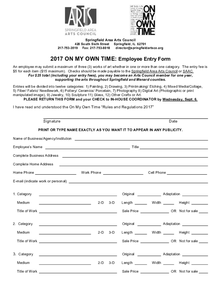 director@springfieldartsco.org2017 ON MY OWN TIME: Employee Entry Form